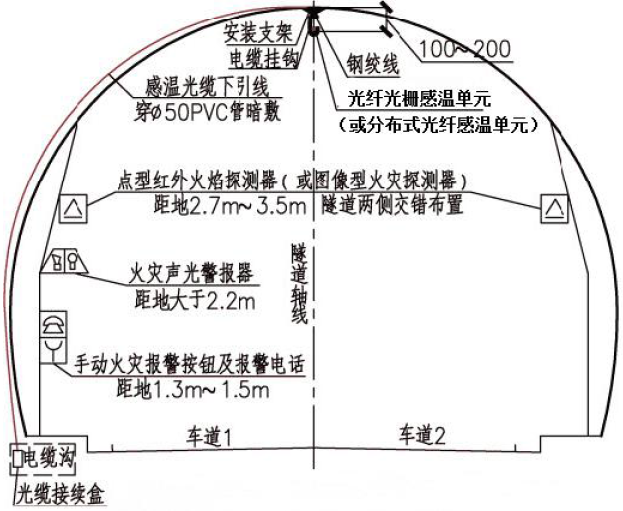 分布式光纖線型感溫火災(zāi)探測(cè)器(或光纖光柵線型感溫火災(zāi)探測(cè)器)應(yīng)設(shè)置在車道頂部距頂棚100mm~200mm,光纖光柵線型感溫火災(zāi)探測(cè)器的光柵間距不應(yīng)大于10m;每根分布式光纖線型感溫火災(zāi)探測(cè)器和光纖光柵線型感溫火災(zāi)探測(cè)器保護(hù)車道的數(shù)量不應(yīng)超過2 條;探測(cè)范圍要求整個(gè)隧道全部覆蓋無探測(cè)盲區(qū)。